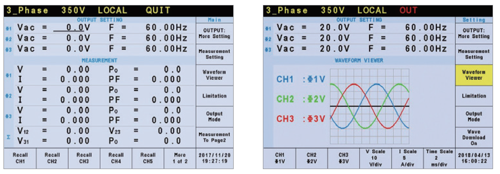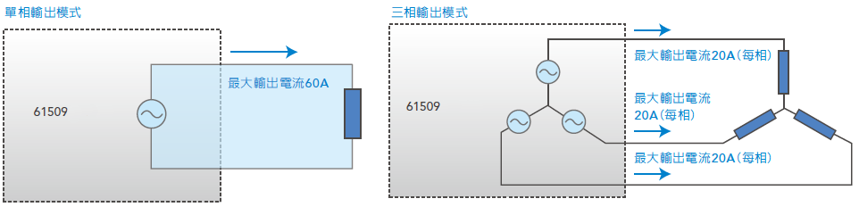 Chroma 61507/61508/61509及61511/61512机种提供选择单相或三相输出功能,使用者可以经由前面板或远端控制选择单相或三相输出模式。即使设置在单相输出模式,仍然可以提供全功率输出的能力,不需担心输出功率规格会有递减的情形。