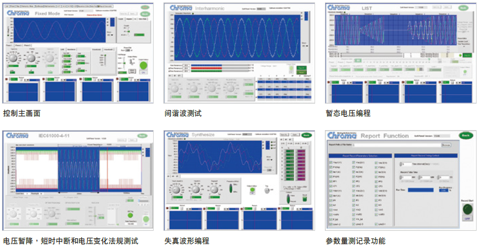 Chroma 61500系列Softpanel是一套专为控制交流电源供应器所设计的电脑图形化操作介面,其多功能的图型化面板及简易的操作方式提供使用者一个多功能及容易操作交流电源供应器的环境。同时可经由预设的IEC抗扰度法规设定进行相关法规测试 (IEC 61000-4-11, IEC 61000-4-13, IEC 61000-4-14, IEC 61000-4-28) 。