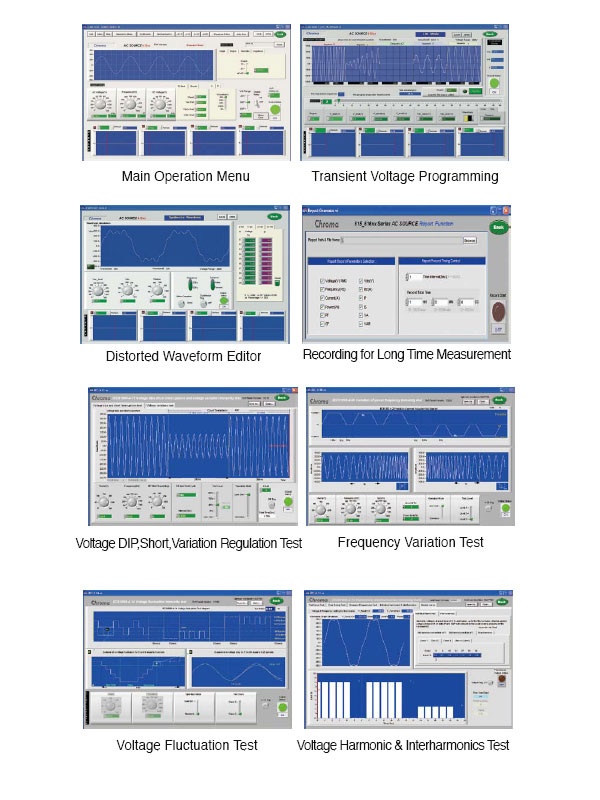 Chroma 61502可编程交流电源提供图形化接口的控制软件, 提供简易设定及操作, 可执行所有的功能. 并内建测试法规. 并可以长时间记录量测值, 存成档案供分析。