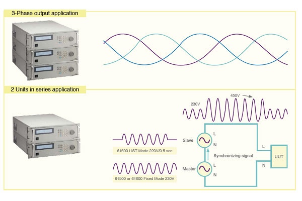 Chroma61504可编程交流电源可以使用三台, 在三相模式的同步机制下, 串联成三相电输出使用. 或使用两台做高压(300V-600V)输出应用, 搭配LIST模式可进行瞬间高压450V/0.5秒的测试, 如图.