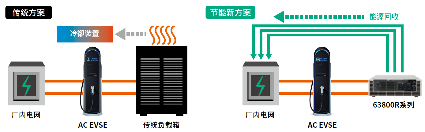63800R系列能源回收式交流電子負載藉由高功率密度和高效率能源回收等特性,在測試領域提供交流電動車充電樁(AC EVSE)全新的節能省碳方案。傳統使用的負載箱不僅體積龐大,更因為將測試能量轉為熱能,造成大量能源耗費,同時須配置對應的置冷系統來避免環境過熱,而Chroma 63800R系列具備最高89%效率之能源回收功能,以使用滿功率拉載為例,一台設備每年可替產線節省116,946kWh的電力,相當於45,258kg的碳排放量,除了達到節能目的之外,亦可大幅縮減置冷成本,且3U高機身對比龐大笨重的負載箱,可帶來更彈性的測試配置。此外,Chroma 63800R系列配備完整的CC、CP、CR拉載模式,符合AC EVSE的CCID/RCD漏電流要求標準,可提供更經濟且可靠的老化測試、拉載特性測試之解決方案。