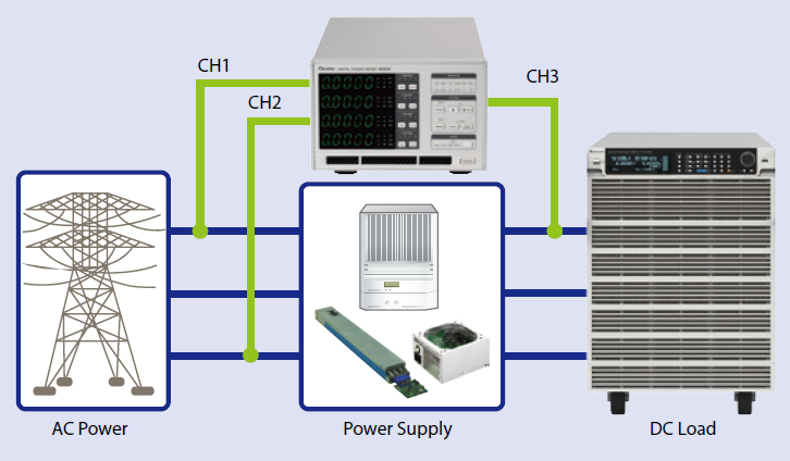 同时,也可使用3P3W三相三线式所支援的两瓦特计量测方式对于三相交流电源待测物进行功率量测,例如:电源供应器功率量测应用。以及使用内建功率效能计算功能计算出电源供应器的整体效能。