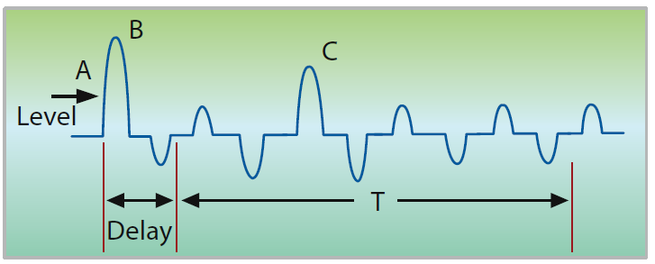 66203/66204数字功率表提供量测涌浪电流(Is)的功能,用户可以设定一个电流准位(A)来触发开始量测电流,或使用后背板的TTL信号来进行触发;另外,可设定延迟参数(Delay),用来延迟真正撷取电流波形的时间,可帮助忽略掉刚开始不需要的波峰B;时间参数T,为实际撷取波形的时间长度。