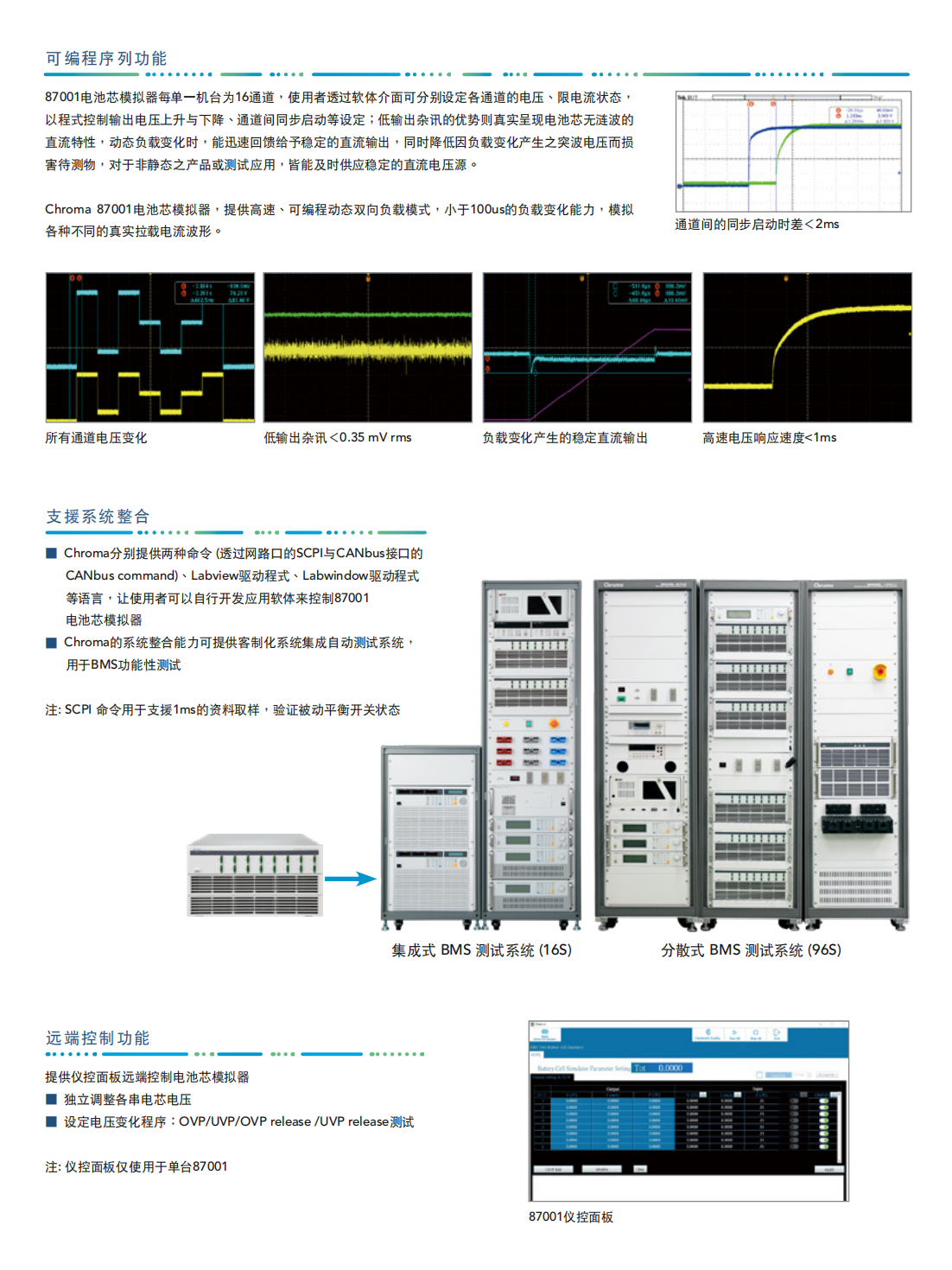 Chroma 87001电池芯模拟器是一款多通道、高精度、以及可程控的双向直流电源,同时具备电压源与电流源功能,可做为多通道的直流电源或电子负载使用。