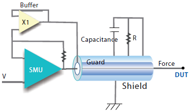 护卫输出(Guarding)的应用在低电流(<奈安)量测时是一项很重要的技术。护卫输出可以避免漏电流的问题,并降低量测稳定时间,此输出可保持与主输出(Force)为同电位,如此在护卫输出与主输出间不会有电流产生。护卫输出同时也消除了电源量测单元与待测体之间导线的电容,使得量测变得快速且精准。
